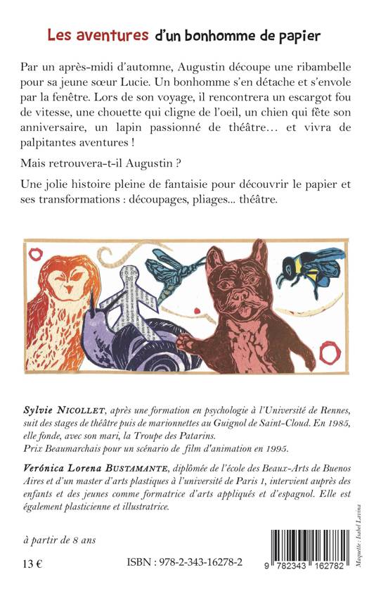 Par un après-midi d'automne, Augustin découpe une ribambelle pour sa soeur Lucie. Un bonhomme s'en détache et s'envole par la fenêtre. Lors d'un voyage mouvementé, le bonhomme de papier aura l'occasion de rencontrer un escargot fou de vitesse, une chouette qui cligne de l'oeil, un chien qui fête son anniversaire, un lapin passionné de théâtre... Mais retrouvera-t-il Augustin ? Une histoire pleine de fantaisie pour découvrir le papier et ses transformations.