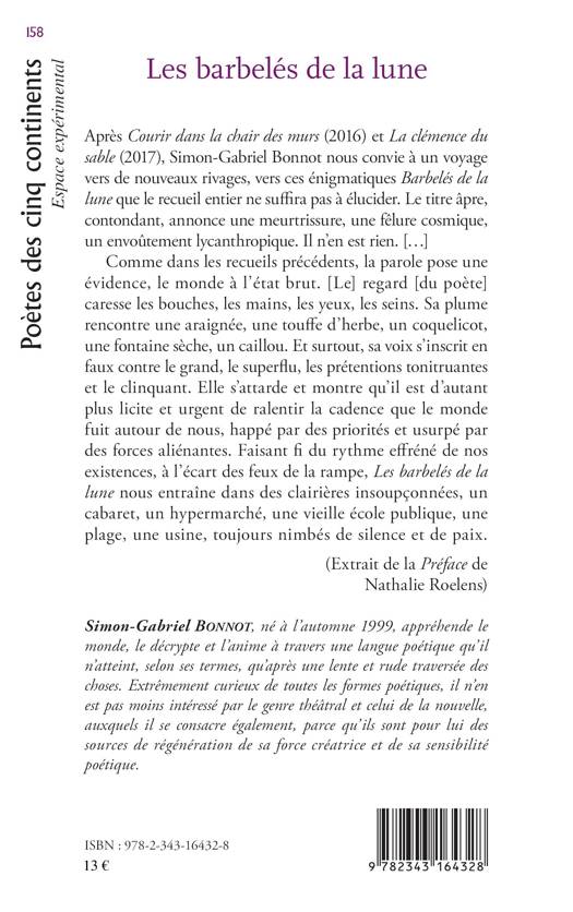 Simon-Gabriel Bonnot nous convie à un voyage vers de nouveaux rivages, vers ces énigmatiques "Barbelés de la lune" que le recueil entier ne suffira pas à élucider. Le titre âpre et contondant annonce une meurtrissure, une fêlure cosmique, un envoûtement lycanthropique. Il n'en est rien. Comme dans ses recueils précédents, la parole pose une évidence : celui d'un monde à l'état brut.