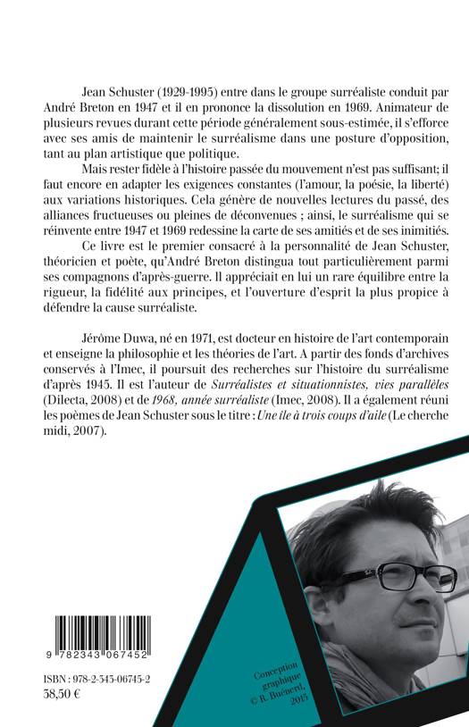 Jean Schuster (1929-1995) entre dans le groupe surréaliste conduit par André Breton en 1947. Animateur de plusieurs revues, il s'efforce avec ses amis de maintenir le surréalisme dans une posture d'opposition, tant au plan artistique que politique. Ce livre est le premier consacré à la personnalité de Jean Schuster, théoricien et poète, qu'André Breton distingua tout particulièrement parmi ses compagnons d'après-guerre. Il appréciait en lui un rare équilibre entre la rigueur, la fidélité aux principes, et l'ouverture d'esprit la plus propice à défendre la cause surréaliste.