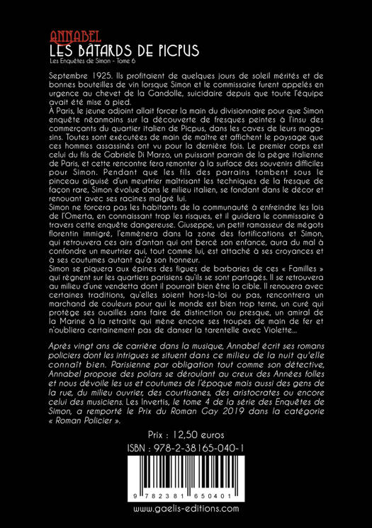 Septembre 1925. Ils profitaient de quelques jours de soleil mérités et de bonnes bouteilles de vin lorsque Simon et le commissaire furent appelés en urgence au chevet de la Gandolle, suicidaire depuis que toute l’équipe avait été mise à pied. À Paris, le jeune adjoint allait forcer la main du divisionnaire pour que Simon enquête néanmoins sur la découverte de fresques peintes à l’insu des commerçants du quartier italien de Picpus, dans les caves de leurs magasins. Toutes sont exécutées de main de maître et affichent le paysage que ces hommes assassinés ont vu pour la dernière fois. Le premier corps est celui du fils de Gabriele Di Marzo, un puissant parrain de la pègre italienne de Paris, et cette rencontre fera remonter à la surface des souvenirs difficiles pour Simon. Pendant que les fils des parrains tombent sous le pinceau aiguisé d’un meurtrier maîtrisant les techniques de la fresque de façon rare, Simon évolue dans le milieu italien, se fondant dans le décor et renouant avec ses racines malgré lui. Simon ne forcera pas les habitants de la communauté à enfreindre les lois de l’Omerta, en connaissant trop les risques, et il guidera le commissaire à travers cette enquête dangereuse. Giuseppe, un petit ramasseur de mégots florentin immigré, l’emmènera dans la zone des fortifications et Simon, qui retrouvera ces airs d’antan qui ont bercé son enfance, aura du mal à confondre un meurtrier qui, tout comme lui, est attaché à ses croyances et à ses coutumes autant qu’à son honneur. Simon se piquera aux épines des figues de barbaries de ces « Familles » qui règnent sur les quartiers parisiens qu’ils se sont partagés. Il se retrouvera au milieu d’une vendetta dont il pourrait bien être la cible. Il renouera avec certaines traditions, qu’elles soient hors-la-loi ou pas, rencontrera un marchand de couleurs pour qui le monde est bien trop terne, un curé qui protège ses ouailles sans faire de distinction ou presque, un amiral de la Marine à la retraite qui mène encore ses troupes de main de fer et n’oubliera certainement pas de danser la tarentelle avec Violette...