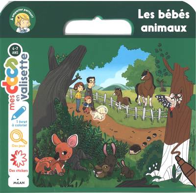 Un livret de coloriage, une vingtaine de stickers à coller sur des posters et quatre jeux visuels sur le thème des bébés animaux.