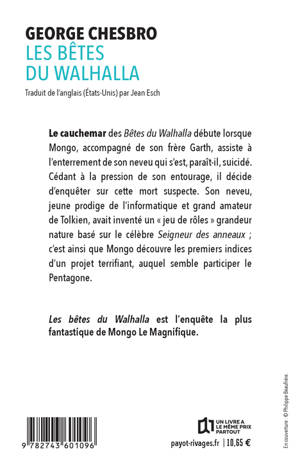 Le cauchemar des bêtes du Walhalla débute lorsque Mongo, accompagné de son frère Garth, assiste à l'enterrement de son neveu qui s'est, paraît-il, suicidé. Cédant à la pression de son entourage, il décide d'enquêter sur cette mort suspecte. Son neveu, jeune prodige de l'informatique et grand amateur de Tolkien, avait inventé un jeu de rôles grandeur nature basé sur le célèbre Seigneur des anneaux ; c'est ainsi que Mongo découvre les premiers indices d'un projet terrifiant, auquel semble participer le Pentagone. «Les bêtes du Walhalla» est l'enquête la plus fantastique de Mongo Le Magnifique.