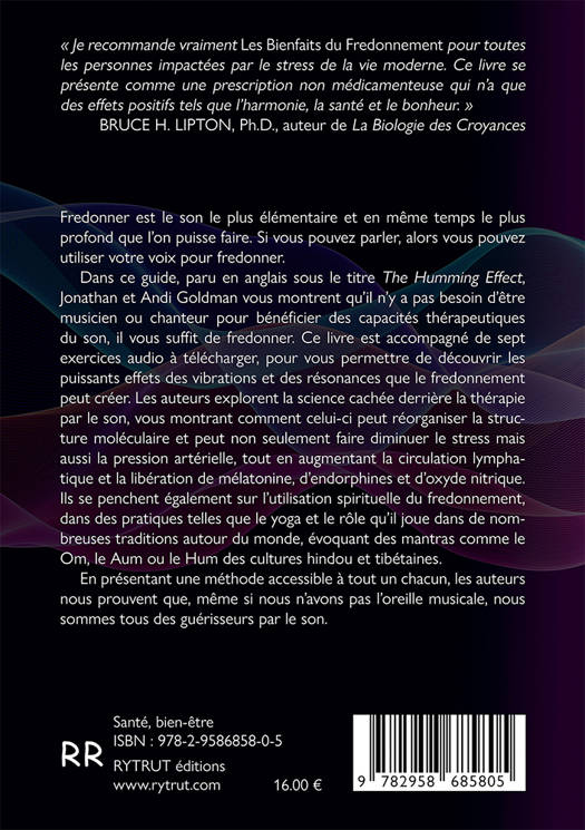 Fredonner est le son le plus élémentaire et en même temps le plus profond que l’on puisse faire. Si vous pouvez parler, alors vous pouvez utiliser votre voix pour fredonner. Dans ce guide, paru en anglais sous le titre The Humming Effect, Jonathan et Andi Goldman vous montrent qu’il n’y a pas besoin d’être musicien ou chanteur pour bénéficier des capacités thérapeutiques du son, il vous suffit de fredonner. Ce livre est accompagné de sept exercices audio à télécharger, pour vous permettre de découvrir les puissants effets des vibrations et des résonances que le fredonnement peut créer. Les auteurs explorent la science cachée derrière la thérapie par le son, vous montrant comment celui-ci peut réorganiser la structure moléculaire et peut non seulement faire diminuer le stress mais aussi la pression artérielle, tout en augmentant la circulation lymphatique et la libération de mélatonine, d’endorphines et d’oxyde nitrique. Ils se penchent également sur l’utilisation spirituelle du fredonnement, dans des pratiques telles que le yoga et le rôle qu’il joue dans de nombreuses traditions autour du monde, évoquant des mantras comme le Om, le Aum ou le Hum des cultures hindou et tibétaines. En présentant une méthode accessible à tout un chacun, les auteurs nous prouvent que, même si nous n’avons pas l’oreille musicale, nous sommes tous des guérisseurs par le son.