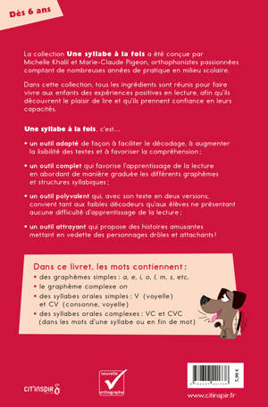 Des textes adaptés pour lire plus facilement ! Pour faciliter l’apprentissage de la lecture, les mots qui composent les histoires ont été sélectionnés en fonction de leur familiarité, de leur structure syllabique et des graphèmes* qu’ils contiennent. Plusieurs adaptations visuelles permettent de réduire la charge cognitive liée au décodage et de limiter l’encombrement perceptif. Les livrets contiennent deux fois la même histoire : dans la première version, syllabes orales, lettres muettes et graphèmes complexes sont mis en relief ; dans la seconde, ces adaptations ne sont pas présentes. Ce sont donc des outils polyvalents qui favorisent le transfert des acquis et qui conviennent à tous les enfants. Les histoires fantaisistes mettent en scène des personnages rigolos et attachants. La trame narrative captive les jeunes lecteurs tout en leur permettant de faire des prédictions. Les illustrations leur donnent aussi de nombreuses occasions de faire des inférences.