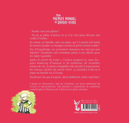 Nous retrouvons les trois élèves de Séraphine : Grognon le gentil cochon, Rustic le petit bouc bagarreur et Cabotin le babouin malin, dans des scènes de la vie quotidienne où ils vont continuer à découvrir les règles élémentaires du savoir-vivre. Gérer sa jalousie, aller au lit, téléphoner, manger proprement, voici quelques-uns des thèmes évoqués par lesquels, chez nos héros comme chez les petits lecteurs, pourra s’éveiller l’intelligence du cœur. Ces 14 histoires sont joliment illustrées par l’auteur , présentées sous forme de dialogues, elles peuvent aussi être jouées par les enfants en famille, à l’école ou même au caté ! « Un petit air de La Fontaine, des couleurs vives et des images pleines de surprises raviront les jeunes lecteurs » (site des AFC)