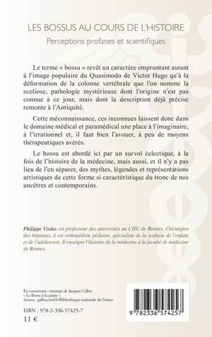 Le terme bossu revêt un caractère empruntant autant à l'image populaire du Quasimodo de Victor Hugo qu'à la déformation de la colonne vertébrale que l'on nomme la scoliose, pathologie mystérieuse dont l'origine n'est pas connue à ce jour, mais dont la description déjà précise remonte à l'Antiquité. Cette méconnaissance, ces inconnues laissent donc dans le domaine médical et paramédical une place à l'imaginaire, à l'irrationnel et, il faut bien l'avouer, à peu de moyens thérapeutiques avérés. Le bossu est abordé ici par un survol éclectique, à la fois de l'histoire de la médecine, mais aussi, et il n'y a pas lieu de l'en séparer, des mythes, légendes et représentations artistiques de cette forme si caractéristique du tronc de nos ancêtres et contemporains.