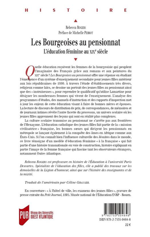 Quelle éducation reçoivent les femmes de la bourgeoisie qui peuplent l’imaginaire des Français grâce aux romans et aux peintures du XIXe siècle ? Les Bourgeoises au pensionnat offre une réponse en étudiant l’émergence d’un système d’enseignement secondaire pour jeunes filles antérieur aux lois républicaines de 1880. À travers l’étude d’établissements très divers, religieux comme laïcs, se dessine un portrait des jeunes filles au pensionnat ainsi que des « instruiseuses », pour reprendre le qualificatif qu’utilise Lamartine pour désigner les nombreuses femmes qui vivent de l’enseignement. L’analyse des programmes d’études, des manuels d’instruction et des rapports d’inspection met à jour les enjeux de cette éducation visant à faire de bonnes mères et épouses. La lecture de discours de distribution de prix, de correspondances, de mémoires et de journaux intimes révèle l’autre facette du processus, un univers scolaire où les jeunes filles apprennent des leçons qui sont en réalité plus complexes. La culture scolaire transmise au pensionnat ne s’arrête pas aux frontières de l’Hexagone. L’éducation catholique des jeunes filles fait partie de la « mission civilisatrice » française, les bonnes soeurs qui dirigent les pensionnats en métropole se lançant également à la conquête des âmes en Afrique comme aux États-Unis. Si l’on connaît bien l’influence culturelle des Jésuites dans le monde, ce livre témoigne d’un modèle d’éducation féminine « à la française » qui fait partie d’une histoire transnationale en voie de construction, histoire expliquant en partie l’image de la femme française qui fascine tant les observateurs étrangers, notamment Outre-Atlantique.