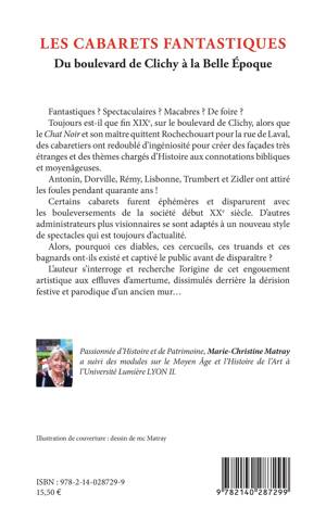 Fantastiques ? Spectaculaires ? Macabres ? De foire ? Toujours est-il que fin XIXe, sur le boulevard de Clichy, alors que le Chat Noir et son maître quittent Rochechouart pour la rue de Laval, des cabaretiers ont redoublé d'ingéniosité pour créer des façades très étranges et des thèmes chargés d'Histoire aux connotations bibliques et moyenâgeuses. Certains cabarets furent éphémères et disparurent avec les bouleversements de la société début XXe siècle. D'autres administrateurs plus visionnaires se sont adaptés à un nouveau style de spectacles qui est toujours d'actualité. Alors, pourquoi ces diables, ces cercueils, ces truands et ces bagnards ont-ils existé et captivé le public avant de disparaître ? L'auteur s'interroge et recherche l'origine de cet engouement artistique aux effluves d'amertume, dissimulés derrière la dérision festive et parodique d'un ancien mur...