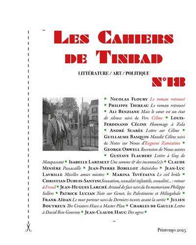 Dans ce 18e numéro des Cahiers de Tinbad, nous saluons une fois de plus l’oeuvre de Louis-Ferdinand Céline, avec un texte d’Ali Benziane né d’un « pèlerinage » vers sa demeure de Meudon, un texte coup-de-canon de Guillaume Basquin sur ses « brouillons », et la republication de son trop méconnu « Hommage à Zola ». Cet hommage est complété de deux petits dossiers : 1/ l’un consacré au Roman retrouvé, livre d’Alain Santacreu passé à la trappe médiatique en 2024, avec Trois études desus ; 2/ l’autre dédié à l’étude de l’anti-utopie Nous d’Evgueni Zamiatine, dont une critique d’époque de George Orwell, qui s’en inspira pour son 1984. Contre l’instrumentalisation de la sexualité des enfants, nous donnons à lire une version complète de l’étude du psychanalyste Christian Dubuis-Santini sur la notion de sexualité infantile chez Freud, victime d’une déformation grossière par erreurs de traduction. Nous republions des poèmes de jeunesse méconnus de la poétesse Marina Tsvétaeva que Bernard Noël avait publiés en son temps chez un petit éditeur dont il dirigeait une collection, et restés inédits depuis. Enfin, le lecteur apprendra l’origine de la fameuse formule de Flaubert sur la « haine du style » en lisant sa Lettre à Maupassant.