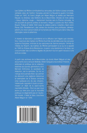 Les Cahiers du Rhône contribuèrent au renouveau de l'édition suisse romande, véritable relais de l'édition française pendant la Deuxième guerre mondiale. Créés en 1942, ils furent dirigés par Albert Béguin et édités par Hermann Hauser, le directeur des Editions de la Baconnière. Divisés en trois séries - bleue, blanche, rouge -, résolument tournés vers la France occupée, ils ont accueilli de grands poètes et écrivains: Aragon y publia Les yeux d'Elsa, Eluard, Poésie et Vérité 1942 (avec le célèbre poème "Liberté"), Saint-John Perse, Exil. Parallèlement, des cahiers de doctrine, plus politiques, développèrent une vision personnaliste et humaniste de l'Homme pris dans l'étau des idéologies nazie et pétainiste. A travers la fabrication quotidienne et la diffusion tant légale que clandestine, l'aventure des Cahiers du Rhône fourmille de démêlés avec les censures suisse et française, victimes du jeu savoureux de "berne-censure". Armés du "Glaive de l'esprit", les Cahiers du Rhône participaient à ce qu'on a appelé en 1945 la "Poésie de la Résistance", à savoir "une résistance à l'air libre" qui s'accomodait des conditions légales de parution tout en ayant recours à une écriture codée. A partir des archives de la Baconnière, du fonds Albert Béguin et des documents de la censure fédérale, Olivier Cariguel a reconstitué l'histoire éditoriale et politique de la collection destinée aux jeunes générations dont Bernard Anthonioz, le secrétaire de rédaction, est le symbole. Ce fut un "refuge de la pensée libre" qui permet de découvrir une vigilance méconnue et exemplaire de la Suisse romande chez quelques-uns de ses citoyens, intellectuels opposés à toute compromission en dépit de la sacro-sainte neutralité officielle. "Tout ce que nous avons pu faire pour que la neutralité politique ne dégénérât pas en neutralité morale, il fallait le faire" tranchera Albert Béguin en 1946.