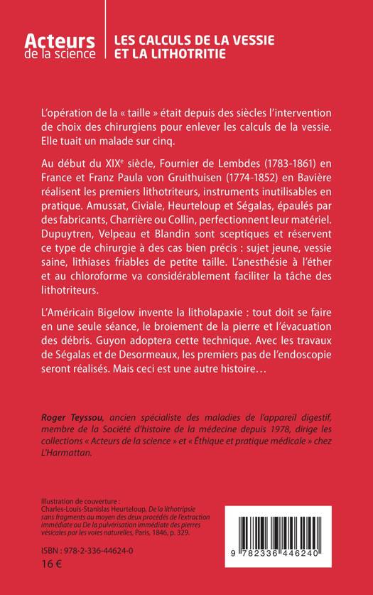 L'opération de la taille était depuis des siècles l'intervention de choix des chirurgiens pour enlever les calculs de la vessie. Elle tuait un malade sur cinq. Au début du XIXe siècle, Fournier de Lembdes (1783-1861) en France et Franz Paula von Gruithuisen (1774-1852) en Bavière réalisent les premiers lithotriteurs, instruments inutilisables en pratique. Amussat, Civiale, Heurteloup et Ségalas, épaulés par des fabricants, Charrière ou Collin, perfectionnent leur matériel. Dupuytren, Velpeau et Blandin sont sceptiques et réservent ce type de chirurgie à des cas bien précis: sujet jeune, vessie saine, lithiases friables de petite taille. L'anesthésie à l'éther et au chloroforme va considérablement faciliter la tâche des lithotriteurs. L'Américain Bigelow invente la litholapaxie: tout doit se faire en une seule séance, le broiement de la pierre et l'évacuation des débris. Guyon adoptera cette technique. Avec les travaux de Ségalas et de Desormeaux, les premiers pas de l'endoscopie seront réalisés. Mais ceci est une autre histoire...