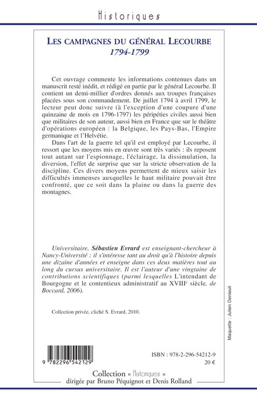 Cet ouvrage commente un manuscrit inédit, rédigé en partie par le général Lecourbe, et contenant les ordres donnés aux troupes françaises sous son commandement de juillet 1794 à avril 1799, en France et en Europe. Les moyens militaires mis en uvre reposait tant sur l'espionnage, l'éclairage, la dissimulation, la diversion que sur la stricte observation de la discipline. Ce témoignage permet de mieux saisir les difficultés auxquelles le haut militaire pouvait être confronté.