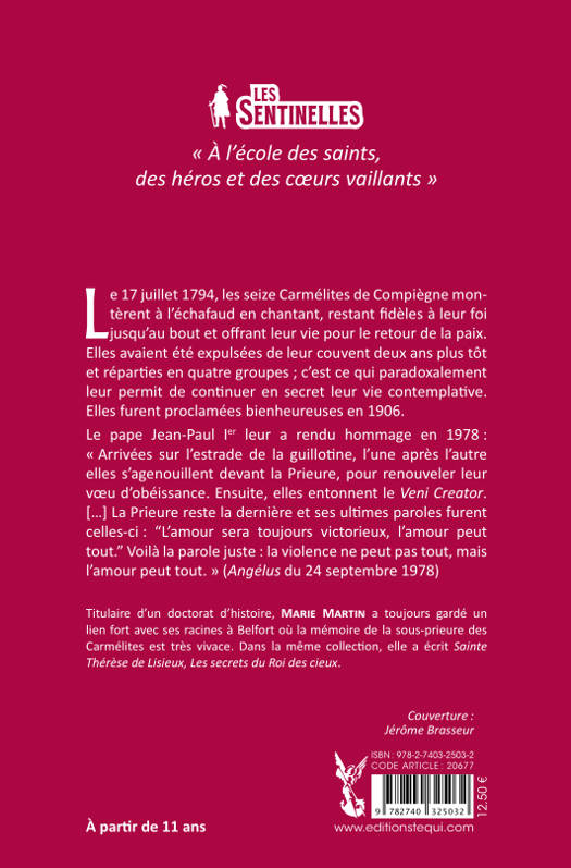Le 17 juillet 1794, à 20 h sur la place du Trône (actuelle place de la Nation), elles sont montées à l’échafaud en chantant pour la paix. Elles avaient été expulsées de leur couvent le 14 septembre 1792 et réparties en quatre groupes. Un carmel en prison : deux ans plus tard, c'est leur arrestation et la prison qui permettent aux Carmélites de se retrouver. Elles en profitent pour vivre ensemble leur règle de vie, et chanter leurs offices. Pour la paix en France : « Arrêtées à Compiègne en juin 1794, et transférées à Paris le 13 juillet, c’est librement, sans ostentation ni exaltation, qu’elles donnèrent leur vie. Leur chant limpide en gravissant les marches de l’échafaud était bien l’expression de leur amour de Jésus. La foule qui était là ne s’y est pas trompée, qui a été saisie par le mystère. » (site du Carmel)