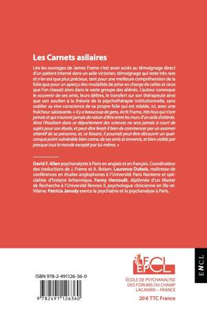 Lire les ouvrages de James Frame, c’est avoir accès au témoignage direct d’un patient interné dans un asile victorien, témoignage qui reste très rare et n’en est que plus précieux, tant pour une meilleure compréhension de la folie que pour un aperçu des modalités de prise en charge de celles et ceux que l’on classait alors dans le vaste groupe des aliénés. L’auteur convoque le souvenir de ses amis, leurs délires, le transfert sur son thérapeute ainsi que son soutien à la théorie de la psychothérapie institutionnelle, sans oublier sa vive conscience de sa propre folie qui est relatée, ici, avec une fraîcheur saisissante. « Il y a beaucoup de gens très fous, écrit Frame, qui n’ont jamais et qui n’auront jamais de raison d’être entre les murs d’un asile d’aliénés. Ainsi l’étudiant dans ce département des sciences ne sera jamais à court de sujets pour son étude, et peut-être ferait-il bien de commencer par un examen attentif de sa personne, et, ce faisant, il pourrait peut-être découvrir un quelconque point vulnérable bien connu de ses amis et ennemis, et bien visible par presque tout le monde excepté par lui-même. »