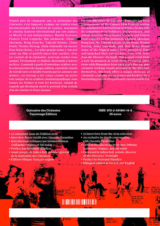 Depuis plus de cinquante ans, la Quinzaine des cinéastes s’est imposée comme un rendez-vous incontournable du Festival de Cannes, marquant le cinéma d’auteur international par son audace, sa liberté et son indépendance. Martin Scorsese, Francis Ford Coppola, Jim Jarmusch, Chantal Akerman, Bong Joon-ho, Takeshi Kitano, Claire Denis, Werner Herzog, Alain Guiraudie ou encore Hou Hsiao-hsien... Les plus grands noms y ont présenté un film et parfois lancé leur carrière. Avec Les Carnets de la Quinzaine, nouveau rendez-vous annuel, l’événement se déploie désormais à travers un livre. Construit à partir d’entretiens réalisés avec les cinéastes lors de chaque édition, enrichi de visuels de travail rares et inédits fournis par les auteurs eux-mêmes, cet ouvrage a été conçu comme un porte-voix unique de la création cinématographique sous toutes ses formes et tous les horizons. Autant de regards qui dessinent aussi le portrait d’un certain état du cinéma et d’une époque. 22 entretiens, issus de l’édition 2024 + interview-fleuve inédit avec Quentin Tarantino , introductions critiques par Jérôme Dittmar, Guillaume Orignac et Yal Sadat , préface de Bertrand Mandico (Les Garçons sauvages, Conann, Roma elastica) , avant-propos de Julien Rejl, délégué général , Édition bilingue français / anglais