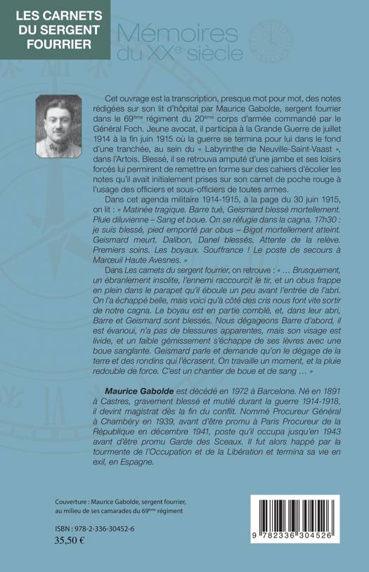 Cet ouvrage est la transcription des notes rédigées sur son lit d'hôpital par Maurice Gabolde, sergent fourrier dans le 69ème régiment du 20ème corps d'armée commandé par le Général Foch. Jeune avocat, il participa à la Grande Guerre de juillet 1914 à fin juin 1915 où la guerre se termina pour lui dans le fond d'une tranchée. Blessé, il se retrouva amputé d'une jambe et ses loisirs forcés lui permirent de remettre en forme les notes qu'il avait prises sur son carnet de poche.