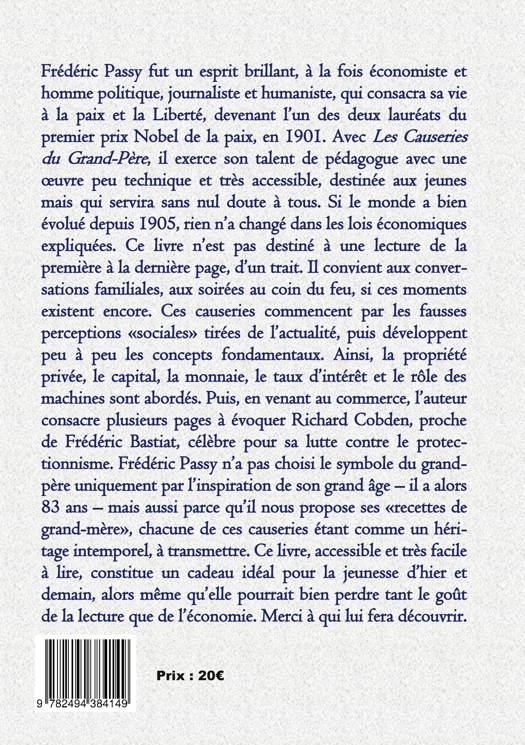 Frédéric Passy fut un esprit brillant, à la fois économiste et homme politique, journaliste et humaniste, qui consacra sa vie à la paix et la Liberté, devenant l'un des deux lauréats du premier prix Nobel de la paix, en 1901. Avec Les Causeries du Grand-Père, il exerce son talent de pédagogue avec une oeuvre peu technique et très accessible, destinée aux jeunes mais qui servira sans nul doute à tous. Si le monde a bien évolué depuis 1905, rien n'a changé dans les lois économiques expliquées. Ce livre n'est pas destiné à une lecture de la première à la dernière page, d'un trait. Il convient aux conversations familiales, aux soirées au coin du feu, si ces moments existent encore. Ces causeries commencent par les fausses perceptions "sociales" tirées de l'actualité, puis développent peu à peu les concepts fondamentaux. Ainsi, la propriété privée, le capital, la monnaie, le taux d'intérêt et le rôle des machines sont abordés. Puis, en venant au commerce, l'auteur consacre plusieurs pages à évoquer Richard Cobden, proche de Frédéric Bastiat, célèbre pour sa lutte contre le protectionnisme. Frédéric Passy n'a pas choisi le symbole du grand-père uniquement par l'inspiration de son grand âge - il a 83 ans à la sortie du livre - mais aussi parce qu'il nous propose ses "recettes de grand-mère", chacune de ces causeries étant comme un héritage intemporel, à transmettre. Ce livre, accessible et très facile à lire, constitue ainsi un cadeau idéal pour la jeunesse d'hier et demain, alors même qu'elle pourrait bien perdre tant le goût de la lecture que celui de l'économie. Merci à qui lui fera découvrir.