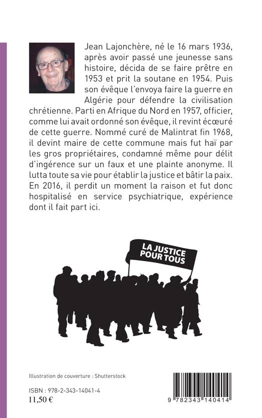 Jean La jonchère décide de se faire prêtre et pris la soutane en 1954. Puis son évêque l'envoya faire la guerre en Algérie pour défendre la civilisation chrétienne. Il revint écoeuré de cette guerre. Nommé curé de Malintrat fin 1968, il devint Maire de cette commune mais fut haï par les gros propriétaires. Il lutta toute sa vie pour la justice et la paix. En 2016, il perdit un moment la raison et fut hospitalisé en service psychiatrique, expérience dont il fait part ici.