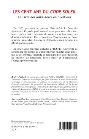 En 1923 paraissait le premier Code Soleil, le Livre des Instituteurs. Ce code professionnel avait pour objet d'exposer tout ce qu'un maître a besoin de savoir sur sa fonction et ses devoirs d'éducateur. Des générations d'instituteurs en École normale jusque dans les années 1990 ont été ainsi formées à la Morale professionnelle. En 2023, deux journées d'études à l'INSPÉ - Université de Strasbourg ont permis de questionner les finalités et les contenus de cet ouvrage, l'identité de l'enseignant et de l'éducateur, les modèles de formation, l'école d'hier et d'aujourd'hui, l'éthique professionnelle.