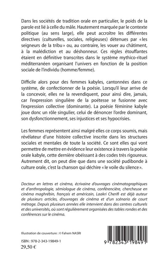 Dans les sociétés de tradition orale, le poids de la parole est lié à celle du mâle. La société kabyle est connue pour son code paroxystique de l'honneur et pour être le creuset d'une civilisation méditerranéenne ancienne, où l'homme occupe un statut hautement valorisé. Difficile alors pour des femmes kabyles, cantonnées dans ce système, de confectionner de la poésie. La poésie féminine kabyle joue un rôle singulier, celui de dénoncer l'ordre dominant, son dysfonctionnement, ses injustices et ses hypocrisies. Les femmes représentent ainsi malgré elles ce corps soumis, mais révélateur d'une histoire collective inscrite dans les structures sociales et mentales de toute la société.