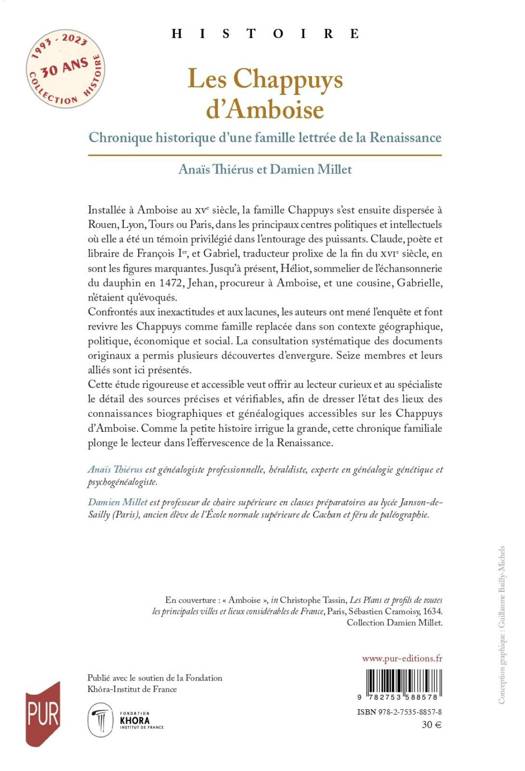 Installée à Amboise au XVe siècle, la famille Chappuys s’est ensuite dispersée à Rouen, Lyon, Tours ou Paris, dans les principaux centres politiques et intellectuels où elle a été un témoin privilégié dans l’entourage des puissants. Claude, poète et libraire de François Ier, et Gabriel, traducteur prolixe de la fin du xvie siècle, en sont les figures marquantes. Jusqu’à présent, Héliot, sommelier de l’échansonnerie du dauphin en 1472, Jehan, procureur à Amboise, et une cousine, Gabrielle, n’étaient qu’évoqués.