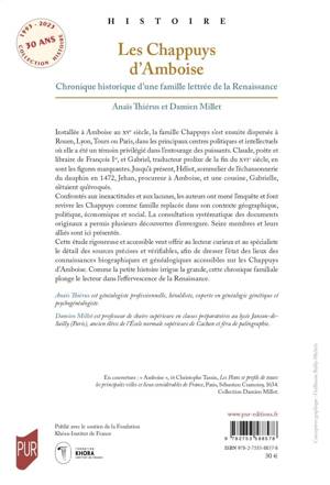 Cette étude rigoureuse et accessible veut offrir au lecteur curieux et au spécialiste le détail des sources précises et vérifiables, afin de dresser l’état des lieux des connaissances biographiques et généalogiques accessibles sur les Chappuys d’Amboise. Comme la petite histoire irrigue la grande, cette chronique familiale plonge le lecteur dans l’effervescence de la Renaissance.
