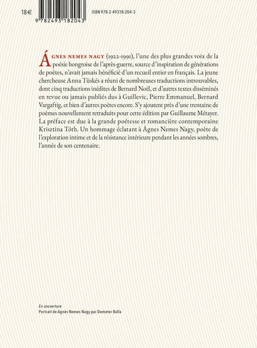 J’ai porté des statues jusque sur le bateau et voilà pourquoi j’ai sombré. Ágnes Nemes Nagy (1922-1991), l'une des plus grandes voix de la poésie hongroise de l'après-guerre, source d'inspiration de générations de poètes, n'avait jamais bénéficié d'un recueil entier en français. La jeune chercheuse Anna Tüskés a réuni de nombreuses traductions introuvables, dont cinq traductions inédites de Bernard Noël, et d'autres testes disséminés en revue ou jamais publiés dus à Guillevic, Pierre Emmanuel, Bernard Vargaftig, et bien d'autres poètes encore. S'y ajoutent près d'une trentaine de poèmes nouvellement retraduits pour cette édition par Guillaume Métayer. La préface est due à la grande poétesse et romancière contemporaine Krisztina Tóth. Un hommage éclatant à Ágnes Nemes Nagy, poète de l'exploration intime et de la résistance intérieure pendant les années sombres, l'année de son centenaire. « Les origines de cette anthologie remonte à 1968, lorsque Péter Balabán, éditeur en chef chargé du domaine étranger aux éditions Corvina (Budapest), encouragé par le secrétaire du PEN club hongrois György Timár, écrivit au poète et écrivain français Paul Chaulot à propos d’un recueil français de poèmes d’Ágnes Nemes Nagy. Chaulot ayant déjà à cette époque adapté un certain nombre de poèmes de Nemes Nagy en français. [...] Toute une partie de ces traductions est déjà parue dans diverses revues et anthologies où elles étaient disséminées. Une autre partie, conservée dans le domaine privée d’Ágnes Nemes Nagy, est ici publiée pour la première fois. Enfin, la troisième partie de ces traductions, due à Guillaume Métayer, a été préparée spécialement pour cette édition. » (extrait de l’avant-propos d’Anna Tüskés)