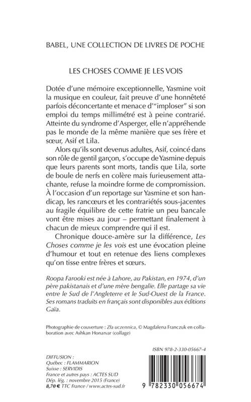 Asif, Lila et Yasmine sont frère et soeurs. Lila a fui la maison, contraignant Asif à s'occuper de Yasmine, qui n'a pas idée du ressentiment qu'elle cause. Elle voit la musique en couleur et se rappelle si bien tant de choses que parfois sa tête lui fait mal. Elle n'est pas heureuse, et sait qu'elle est spéciale. Un jour, une équipe de télévision vient réaliser un reportage sur le syndrome d'Asperger et la vie de Yasmine. Un roman à trois voix doux-amer et touchant.