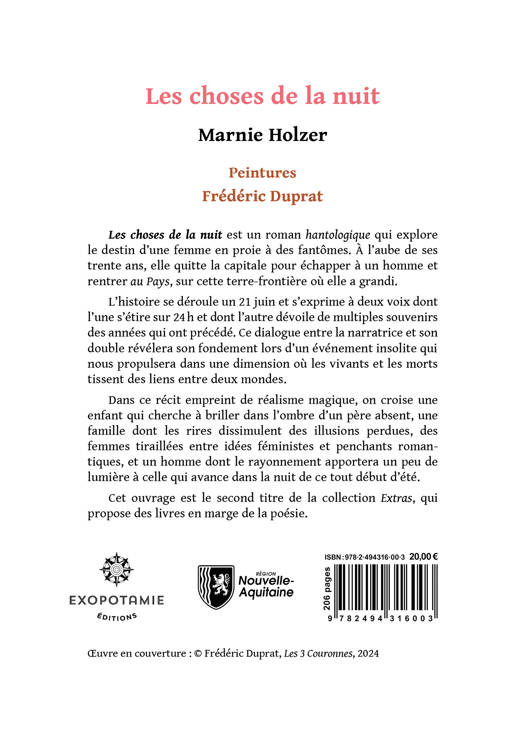 Les choses de la nuit est un roman hantologique qui explore le destin d’une femme en proie à des fantômes. À l’aube de ses trente ans, elle quitte la capitale pour échapper à un homme et rentrer au Pays, sur cette terre-frontière où elle a grandi. L’histoire se déroule un 21 juin et s’exprime à deux voix dont l’une s’étire sur 24 h et dont l’autre dévoile des souvenirs des années qui ont précédé. Ce dialogue entre la narratrice et son double révélera son fondement lors d’un événement insolite qui nous propulsera dans une dimension où les vivants et les morts tissent des liens entre deux mondes. Dans ce récit empreint de réalisme magique, on croise une enfant qui cherche à briller dans l’ombre d’un père absent, une famille dont les rires dissimulent des illusions perdues, des femmes tiraillées entre idées féministes et penchants romantiques, et un homme dont le rayonnement apportera un peu de lumière à celle qui avance dans la nuit de ce tout début d’été.