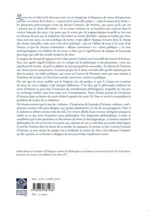 Quand on lit Aristote dans son texte, on est frappe par la frequence du retour d'expressions comme la science de la chose , a partir de la chose elle-meme , dans la nature de la chose ; les physiciens presocratiques n'ont pu deviner l'essence, dit Aristote, que parce qu'ils ont ete pousses par la chose elle-meme . Si ce retour insistant ne se manifeste pas toujours dans la version francaise du texte, c'est parce que le terme grec de pragma recueille en lui tout un faisceau de sens que la traduction fait eclater en termes distincts: pragma se traduit par chose, mais aussi par cause, au sens juridique du terme, et par affaire. pragma recouvre donc le champ des choses naturelles, mais aussi celui de la politique; qui est l'affaire de tous et la cause d'un chacun, et que les Anciens nommaient affaires communes et chose publique . Ce sens anthropologique s'est oblitere de nos jours, si bien que la signification de pragma est beaucoup plus large que celle du vocable moderne de chose. La largeur du champ de pragma invite a faire porter l'analyse sur l'ensemble de l'oeuvre d'Aristote. Sous son aspect negatif d'abord, avec la critique de la sophistique et du platonisme; sous son aspect positif ensuite, tel qu'il se deploie en trois perspectives essentielles: la relation de l'homme aux choses par la connaissance; la nature propre de la chose concrete telle qu'elle subsiste par soi dans la nature; la realite politique, qui certes est l'oeuvre de l'homme, mais qui aussi subsiste a l'exterieur de lui dans la Cite d'une maniere autonome comme re-publique. On sait que les textes publies par le Stagirite ont ete perdus, et que le Corpus est constitue de notes de cours redigees a des epoques differentes. C'est dire que le philosophe meditant les ecrits d'Aristote ne peut faire l'economie de considerations philologiques, lesquelles ne sont pas ici surcharge erudite mais font corps avec l'interpretation. Ainsi, l'etude precise de l'evolution d'Aristote dans sa theorie du sentir eclaire la genese du traite De l'ame et invite a reconsiderer le probleme de la date de sa redaction. On resume souvent par le mot de realisme l'inspiration de la pensee d'Aristote, realisme naif ajoutent certains naifs pour designer une pensee parfaitement au fait de ses presupposes. Mais si le realisme se definit comme visee du reel, il se trouve affecte d'une enorme ambiguite puisque la realite est ce que tente d'exprimer toute philosophie. Une inspiration philosophique va donc se caracteriser par le lieu particulier ou elle invente de situer ce reel enigmatique; si Aristote ramene la philosophie du ciel sur la terre c'est parce que, refusant de voir ce reel dans un monde ideal separe, il veut lire l'essence dans les choses de ce monde, les p ata. Le recours ici fait, a travers la pensee d'Aristote, au sens ancien de ... vise a revaloriser la notion de chose, a lui redonner l'ampleur qu'elle a perdue en se bornant a designer de nos jours l'objet simplement inerte.