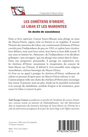 Dans ce livre captivant, l'auteur franco-libanais nous plonge au coeur du Moyen-Orient, région riche en histoire et en tragédies. Il raconte l'histoire des maronites du Liban, une communauté chrétienne d'Orient cruciale pour l'indépendance du pays en 1943, et explore leurs victoires, leurs défaites, mais aussi leurs saints, leurs héros et leurs défis actuels. Il met ainsi en lumière les bâtisseurs de l'indépendance et les décideurs politiques sans envergure qui ont plongé cette nation dans le chaos. Dans une perspective personnelle, il partage ses expériences avec les chrétiens d'Orient, notamment la récupération du couvent de Saint-Maron sur l'Oronte. Il défend le vivre-ensemble entre religions monothéistes, richesse historique du Moyen-Orient. Ce livre est un appel à protéger les chrétiens d'Orient, médiateurs de culture et porteurs d'espoir pour un Moyen-Orient tolérant et uni. L'auteur propose enfin une charte des chrétiens d'Orient pour encourager leur retour. Il présente aussi un plan, fondé sur la neutralité territoriale et le concept du chehabisme, symbole d'espoir et de renaissance, pour sauver le Liban et trouver la paix.