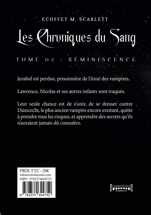 Jezabel est perdue, prisonnière de l'Aîné des vampires. Lawrence, Nicolas et ses autres infants sont traqués. Leur seule chance est de s'unir, de se dresser contre Diancecht, le plus ancien vampire encore existant, quitte à prendre tous les risques, et apprendre des secrets qu'ils n'auraient jamais dû connaître. À PROPOS DE L'AUTRICE Née en 1986, passionnée d'écriture depuis l'adolescence, rêveuse intempestive, toujours dans son imaginaire, Scarlett M. Ecoffet est une créatrice dans l'âme. Son parcours scolaire est composé de littérature et d'une carrière créative en tant que Designer-Web.