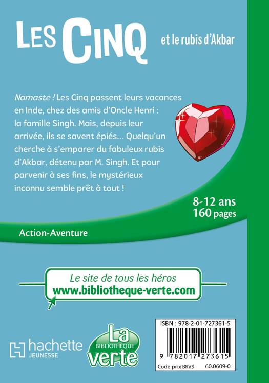 Namaste ! Les Cinq passent les vacances en Inde, chez des amis d’Oncle Henri : la famille Singh. Mais, depuis leur arrivée, ils se savent épiés… Quelqu’un cherche à s’emparer du fabuleux rubis d’Akbar, détenu par M. Singh. Et pour parvenir à ses fins, le mystérieux inconnu semble prêt à tout !