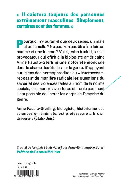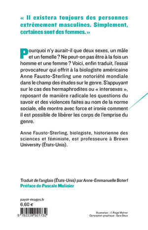 Pourquoi n'y aurait-il que deux sexes, un mâle et un femelle ? Ne peut-on pas être à la fois un homme et une femme ? Voici, enfin traduit, l'essai provocateur qui offrit à la biologiste américaine Anne Fausto-Sterling une notoriété mondiale dans le champ des études sur le genre. S'appuyant sur le cas des hermaphrodites ou « intersexes », reposant de manière radicale les questions du savoir et des violences faites au nom de la norme sociale, elle montre avec force et ironie comment il est possible de libérer les corps de l'emprise du genre.