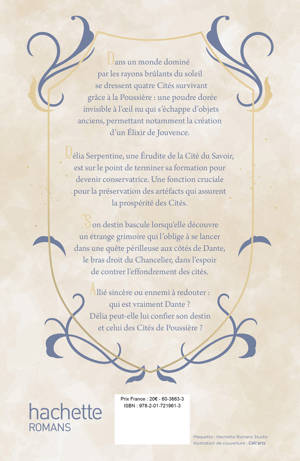 Dans un monde dominé par les rayons brûlants du soleil se dressent quatre Cités survivant grâce à la Poussière : une poudre dorée invisible à l’œil nu qui s’échappe d’objets anciens, permettant notamment la création d'un l’Élixir de Jouvence. Délia Serpentine, une Érudite de la Cité du Savoir, est sur le point de terminer sa formation pour devenir conservatrice. Une fonction cruciale pour la préservation des artéfacts qui assurent la prospérité des cités. Son destin bascule lorsqu’elle découvre un étrange grimoire qui l'oblige à se lancer dans une quête périlleuse aux côtés de Dante, le bras droit du Chancelier, dans l’espoir de contrer l’effondrement des cités. Allié sincère ou ennemi à redouter : qui est vraiment Dante ? Délia peut-elle lui confier son destin et celui des Cités de Poussière ?
