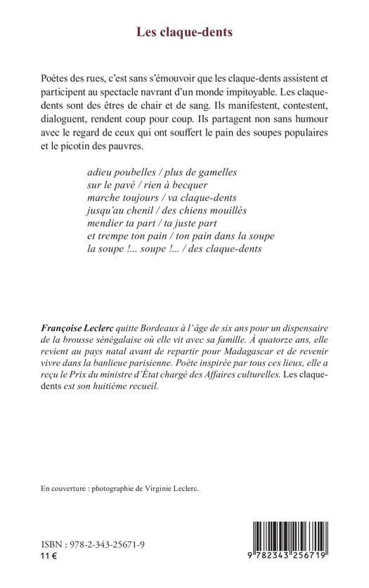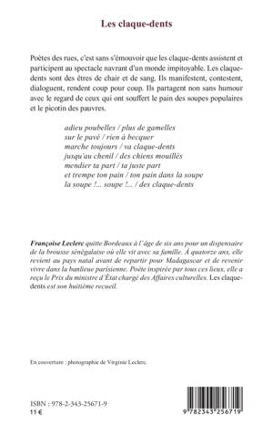 Poètes des rues, c’est sans s’émouvoir que les claque-dents assistent et participent au spectacle navrant d’un monde impitoyable. Les claque-dents sont des êtres de chair et de sang. Ils manifestent, contestent, dialoguent, rendent coup pour coup. Ils partagent non sans humour avec le regard de ceux qui ont souffert le pain des soupes populaires et le picotin des pauvres.