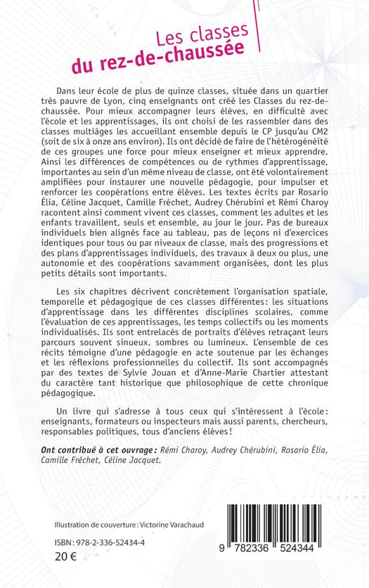 Dans leur école de plus de quinze classes, située dans un quartier très pauvre de Lyon, cinq enseignants ont créé les classes du rez-de-chaussée. Pour mieux accompagner leurs élèves, en difficulté avec l'école et les apprentissages, ils ont choisi de les rassembler dans des classes multiâges les accueillant ensemble depuis le CP jusqu'au CM2 (soit de six à onze ans environ). Ils ont décidé de faire de l'hétérogénéité de ces groupes une force pour mieux enseigner et mieux apprendre. Ainsi les différences de compétences ou de rythmes d'apprentissage, importantes au sein d'un même niveau de classe, ont été volontairement amplifiées pour instaurer une nouvelle pédagogie, pour impulser et renforcer les coopérations entre élèves. Les textes écrits par Rosario Élia, Céline Jacquet, Camille Fréchet, Audrey Chérubini et Rémi Charoy racontent ainsi comment vivent ces classes, comment les adultes et les enfants travaillent, seuls et ensemble, au jour le jour. Pas de bureaux individuels bien alignés face au tableau, pas de leçons ni d'exercices identiques pour tous ou par niveaux de classe, mais des progressions et des plans d'apprentissages individuels, des travaux à deux ou plus, une autonomie et des coopérations savamment organisées, dont les plus petits détails sont importants. Les six chapitres décrivent concrètement l'organisation spatiale, temporelle et pédagogique de ces classes différentes les situations d'apprentissage dans les différentes disciplines scolaires, comme l'évaluation de ces apprentissages, les temps collectifs ou les moments individualisés. Ils sont entrelacés de portraits d'élèves retraçant leurs parcours souvent sinueux, sombres ou lumineux. L'ensemble de ces récits témoigne d'une pédagogie en acte soutenue par les échanges et les réflexions professionnelles du collectif. Ils sont accompagnés par des textes de Sylvie Jouan et d'Anne-Marie Chartier attestant du caractère tant historique que philosophique de cette chronique pédagogique. Un livre qui s'adresse à tous ceux qui s'intéressent à l'école enseignants, formateurs ou inspecteurs mais aussi parents, chercheurs, responsables politiques, tous d'anciens élèves !