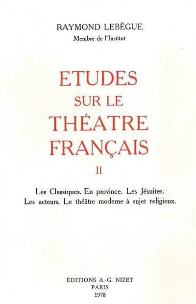Ce second tome des Etudes sur le theatre francais de Raymond Lebegue est surtout consacre aux XVIIe et XVIIIe siecles. Si les tragedies de Corneille et Racine ou les comedies de Moliere sont largement commentees et contextualisees, une grande place est accordee a des etudes speciales, a la fois originales et essentielles: evolution du statut et de la condition des acteurs, histoire des decors et accessoires theatraux, avatars des rapports complexes (souvent apres) entre le theatre et la religion, ou entre le "theatre lu" et le "theatre vu". Les analyses de Raymond Lebegue sont d'autant plus fines qu'elles se trouvent toujours inscrites dans le contexte historique, politique, social et religieux. Jamais un genre theatral n'est scolairement etudie pour lui-meme. Chaque sujet est traite dans une perspective historique non-lineaire, l'auteur privilegiant les notions analytiques d'agencement, de co-existence, de parallelisme ou de divergence.