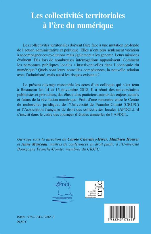 Les collectivités territoriales doivent faire face à une mutation profonde de l'action administrative et politique. Elles n'ont plus seulement vocation à accompagner ces évolutions mais également à les générer. Dès lors de nombreuses interrogations apparaissent. Comment les personnes publiques locales s'inscrivent-elles dans l'économie du numérique ? Quels sont leurs nouvelles compétences, la nouvelle relation avec l'administré, mais aussi les risques existants ? Le présent ouvrage rassemble les actes d'un colloque qui s'est tenu à Besançon les 14 et 15 novembre 2018.
