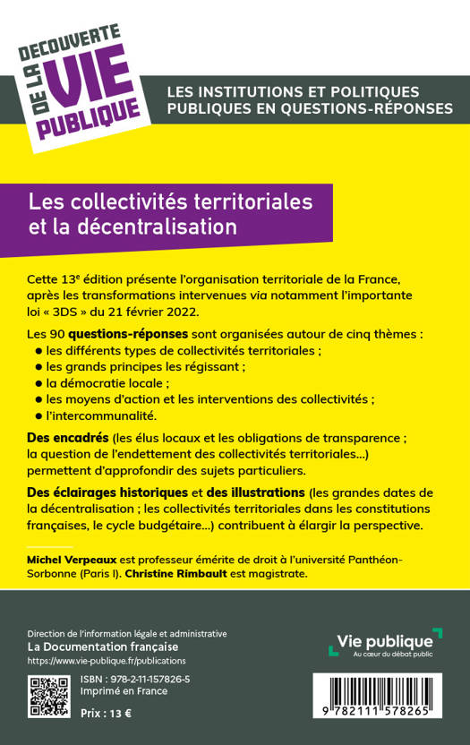 Cette 13e édition présente les collectivités territoriales (CT) françaises en 2024 : - les grands types de collectivités (communes, intercommunalités, départements et régions) - les grands principes qui les régissent (dont : décentralisation et libre administration) - les moyens d’action et les interventions des collectivités territoriales - la démocratie locale - l’intercommunalité.