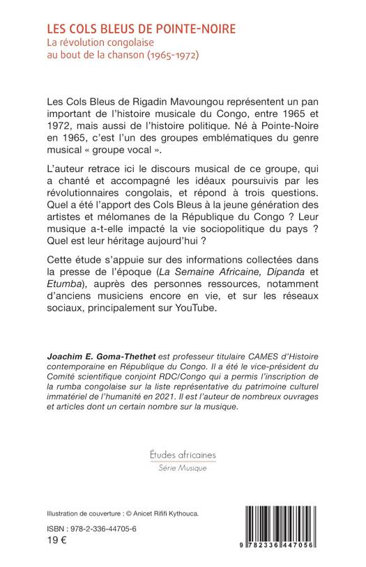 Les Cols Bleus de Rigadin Mavoungou représentent un pan important de l’histoire musicale du Congo, entre 1965 et 1972, mais aussi de l’histoire politique. Né à Pointe-Noire en 1965, c’est l’un des groupes emblématiques du genre musical « groupe vocal ». L’auteur retrace ici le discours musical de ce groupe, qui a chanté et accompagné les idéaux poursuivis par les révolutionnaires congolais, et répond à trois questions. Quel a été l’apport des Cols Bleus à la jeune génération des artistes et mélomanes de la République du Congo ? Leur musique a-t-elle impacté la vie sociopolitique du pays ? Quel est leur héritage aujourd’hui ? Cette étude s’appuie sur des informations collectées dans la presse de l’époque (La Semaine Africaine, Dipanda et Etumba), auprès des personnes ressources, notamment d’anciens musiciens encore en vie, et sur les réseaux sociaux, principalement sur YouTube.