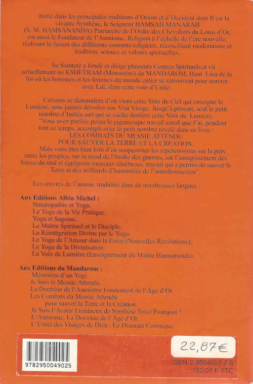 Description : Le Messie de Synthèse attendu par tous les courants spirituels et religieux est revenu comme l’annonçaient les prophètes et les textes sacrés. Nous découvrons Son rôle, Ses difficultés sans nombre, le poids immense de Ses responsabilités. Sont ici révélées de grandes vérités sur le passé de notre Humanité et les batailles dans l’invisible livrées par le Messie, de 1984 à 1990. Lors de ces batailles, les hiérarchies démoniaques entraînant l’humanité vers l’autodestruction furent tour à tour enchaînées. Les répercussions de ces combats se cristallisèrent dans la matière par de nombreux événements cités dans ce livre.