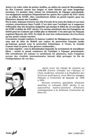 Jetées à la volée, telles de petites Antilles, au milieu du canal de Mozambique, les Iles Comores eurent une longue et riche histoire qui resta longtemps inconnue. Ce premier tome retrace les événements de l'époque précoloniale. Les navigateurs européens fréquentèrent les quatre îles à partir du XVIe siècle et, au début du XVIIIe, elles constituèrent même un grand repaire pour les flibustiers chassés des Caraïbes.