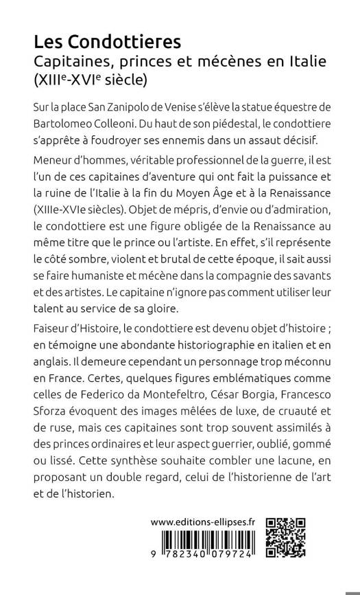 Faiseur d’Histoire, le condottiere est devenu objet d’histoire ; en témoigne une abondante historiographie en italien et en anglais. Il demeure cependant un personnage trop méconnu en France. Certes, quelques figures emblématiques comme celles de Federico da Montefeltro, César Borgia, Francesco Sforza évoquent des images mêlées de luxe, de cruauté et de ruse, mais ces capitaines sont trop souvent assimilés à des princes ordinaires et leur aspect guerrier, oublié, gommé ou lissé. Cette synthèse souhaite combler une lacune, en proposant un double regard, celui de l’historienne de l’art et de l’historien.