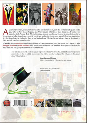 Au commencement, c’est une histoire vieille comme le monde, celle des petits soldats qu’on enrôle pour aller se faire trouer la peau, aux Thermopyles, à Fontenoy ou à Sarajevo… Ensuite il est question de la France, de la Révolution et du général Jourdan qui inventa la conscription… ça se termine par une bande de jeunes gens de 20, 30, 40, 50, 60, 70, 80, 90 ans… qui déferlent par vagues tous les derniers dimanche de janvier dans la rue Nationale de Villefranche-sur-Saône ; dans le Beaujolais et bien au delà, tout le reste de l’année. L’histoire, c’est Jean Prost qui nous la raconte, de l’antiquité à nos jours, de Sparte à la Calade. La fête, Philippe Branche et Julien Verchère nous la font vivre ou revivre : de la remise du drapeau au retinton, du haut de la rue Nat’, jusqu’au sommet du Mont Brouilly.