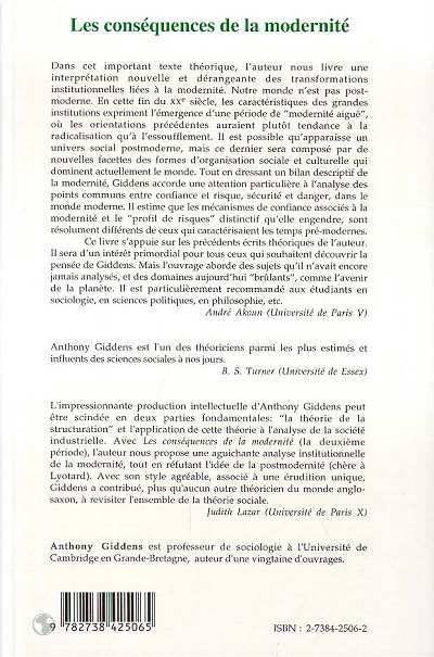 A. Giddens nous propose une analyse institutionnelle de la modernité, tout en réfutant l'idée de postmodernité. Il dresse un bilan descriptif de la modernité et accorde une attention particulière à l'analyse des points communs entre confiance et risque, sécurité et danger, dans le monde moderne.