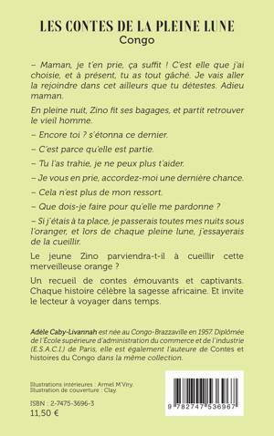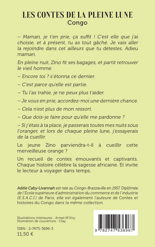 – Maman, je t’en prie, ça suffit ! C’est elle que j’ai choisie, et à présent, tu as tout gâché. Je vais aller la rejoindre dans cet ailleurs que tu détestes. Adieu maman. En pleine nuit, Zino fit ses bagages, et partit retrouver le vieil homme. – Encore toi ? s’étonna ce dernier. – C’est parce qu’elle est partie. – Tu l’as trahie, je ne peux plus t’aider. – Je vous en prie, accordez-moi une dernière chance. – Cela n’est plus de mon ressort. – Que dois-je faire pour qu’elle me pardonne ? – Si j’étais à ta place, je passerais toutes mes nuits sous l’oranger, et lors de chaque pleine lune, j’essayerais de la cueillir. Le jeune Zino parviendra-t-il à cueillir cette merveilleuse orange ? Un recueil de contes émouvants et captivants. Chaque histoire célèbre la sagesse africaine. Et invite le lecteur à voyager dans temps.