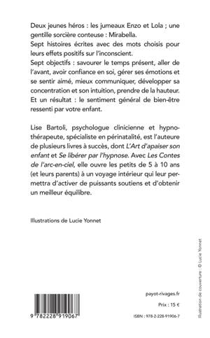 Deux jeunes héros : les jumeaux Enzo et Lola ; une gentille sorcière conteuse : Mirabella. Sept histoires écrites avec des mots choisis pour leurs effets positifs sur l'inconscient. Sept objectifs : savourer le temps présent, aller de l'avant, avoir confiance en soi, gérer ses émotions et se sentir aimé, mieux communiquer, développer sa concentration et son intuition, prendre de la hauteur. Et un résultat : le sentiment général de bien-être ressenti par votre enfant.