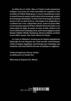 Au debut du XIXe siecle, Mary et Charles Lamb entreprirent d'adapter sous forme de contes l'ensemble des tragedies et des comedies de William Shakespeare. Le succes immediat que connut ce recueil etonna les auteurs, qui l'avaient ecrit en hommage au genie du dramaturge elisabethain, et dans le but d'encourager les jeunes lecteurs a lire ses chefs-d'oeuvre, a developper leur imagination et a renforcer leur vertu. Aujourd'hui encore, toutes les jeunes filles et tous les jeunes garcons d'Outre-Manche decouvrent grace a ces contes pleins de magie, de poesie, de mort, de folie, d'amour et de rire les celebres heros shakespeariens, qu'ils soient tragiques comme Hamlet, Ophelie, Othello, Desdemone, Romeo et Juliette, ou droles et merveilleux comme Ariel, Puck, Oberon ou Titania. Les Contes de Shakespeare n'avaient pas ete traduits integralement depuis plus de cent cinquante ans. Cette nouvelle version francaise restitue la langue magnifique, aussi baroque que romantique, qui caracterise cette rarete litteraire devenue un classique en Angleterre.