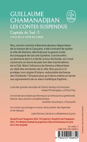 Nox, ancien commis d’épicerie devenu négociateur de la maison de la Caouane, a été contraint de quitter la ville de Gemina déchirée par la guerre civile. Accompagné de son ami Symètre, il arrive enfin au domaine dont il a hérité, la tour de Garde, où il veut construire un havre de paix loin des machinations de la Cité. Mais l’influence de Gemina s’étend bien au-delà des enceintes de la ville. Nox pourra-t-il protéger son utopie d’Iolana, redoutable duchesse des Oreillards ? D’autant plus qu’il devra mettre un terme aux agissements de sa sœur maléfique Daphné…